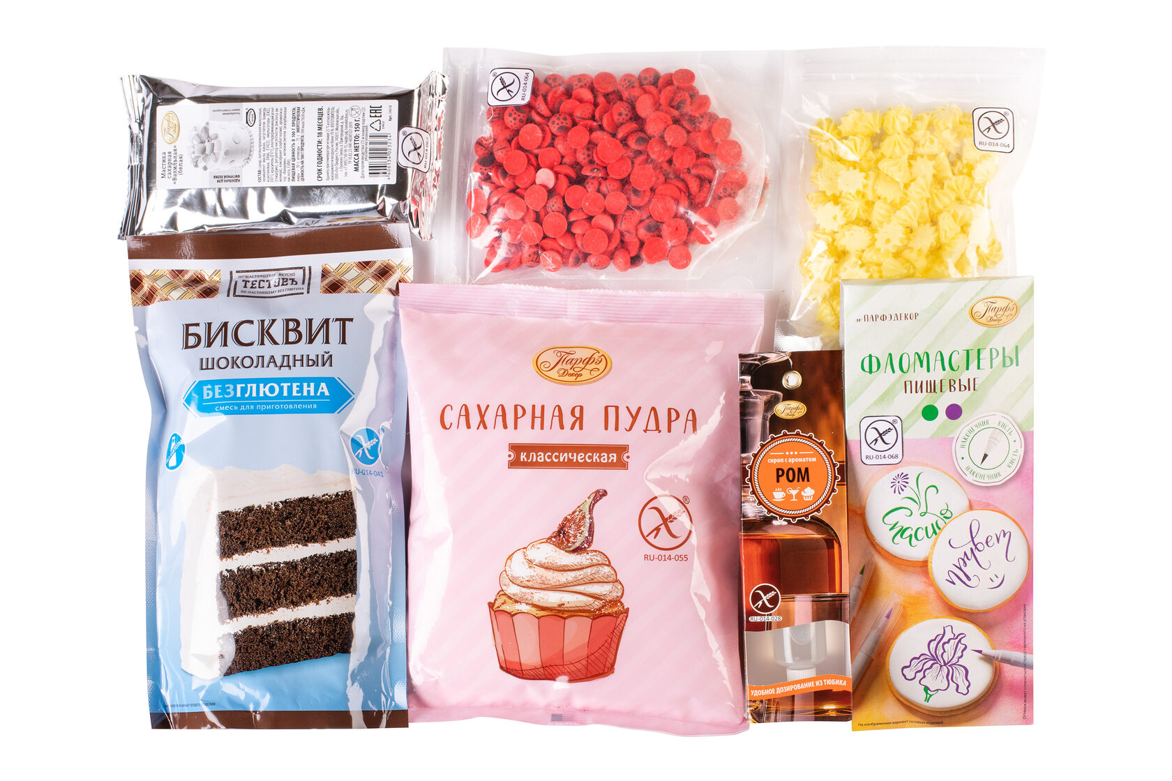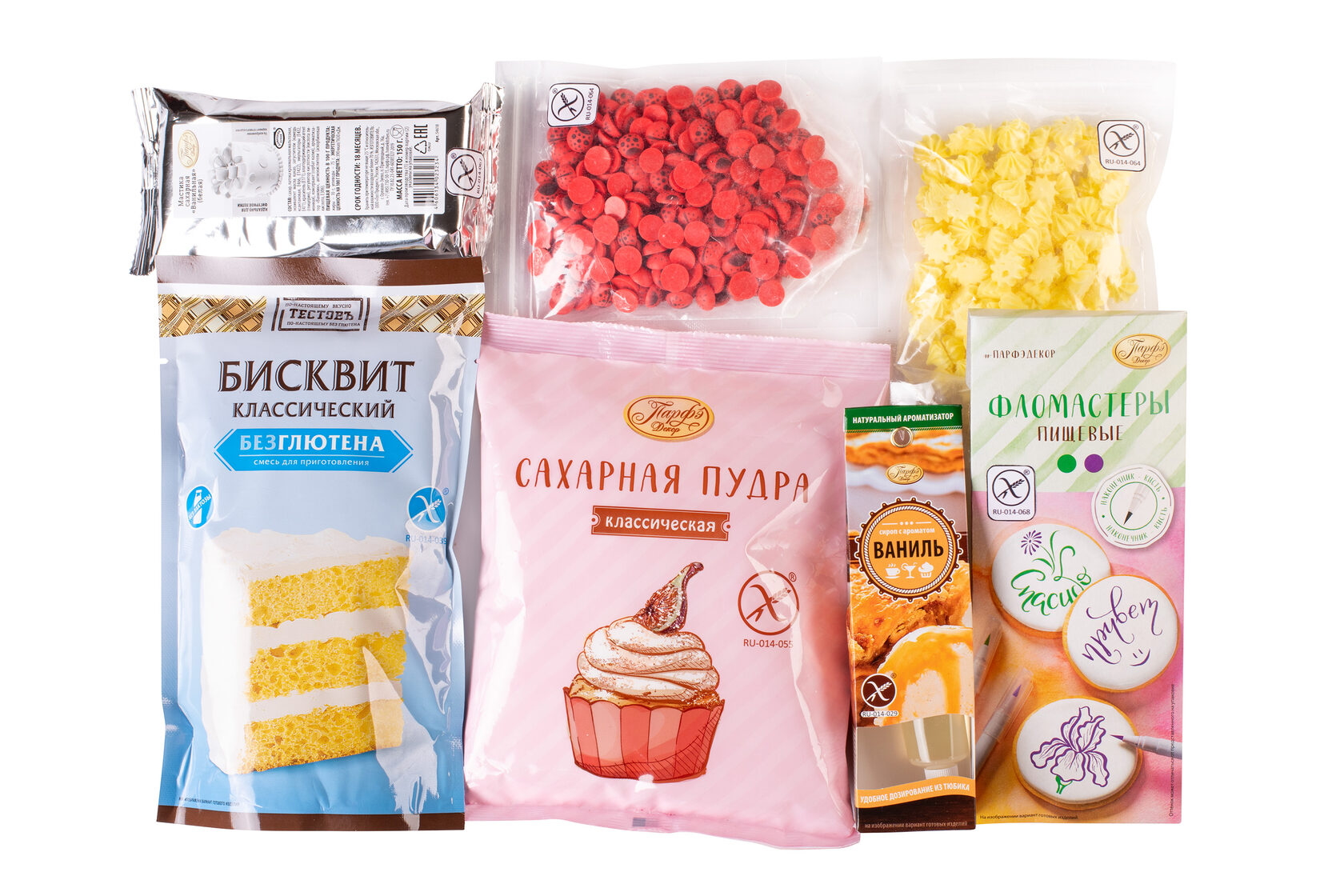 Наборы «Сделай Торт» помогут быстро и просто приготовить праздничный торт без глютена. Вся продукция в наборе имеет знак «Перечеркнутый колос» - международный символ безопасности продуктов без глютена. На выбор представлены два варианта: набор с ванильным или набор с шоколадным бисквитом.