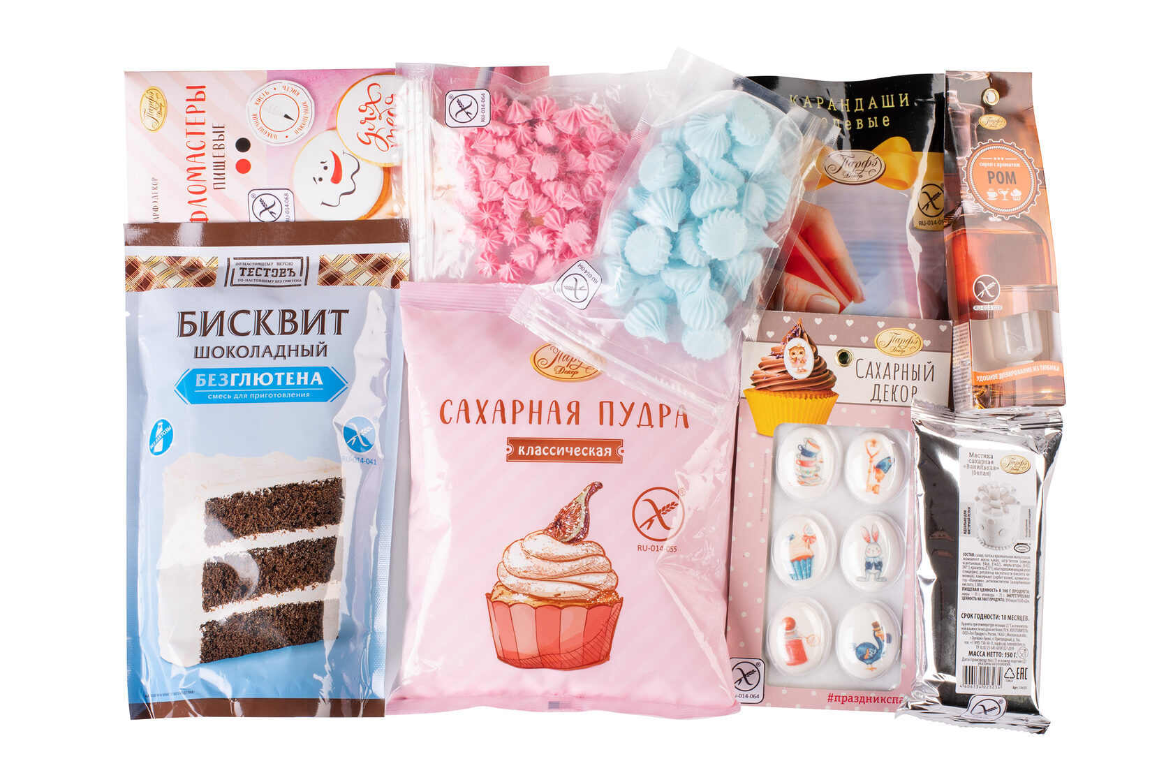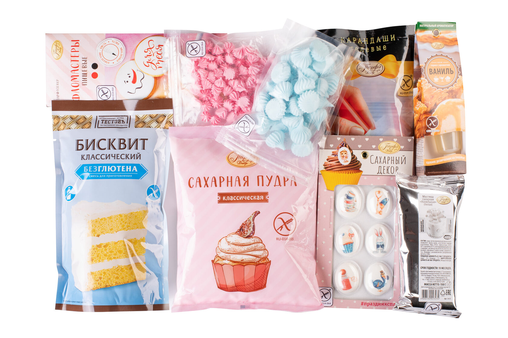 Наборы «Сделай Торт» помогут быстро и просто приготовить праздничный торт без глютена. Вся продукция в наборе имеет знак «Перечеркнутый колос» - международный символ безопасности продуктов без глютена. На выбор представлены два варианта: набор с ванильным или набор с шоколадным бисквитом.